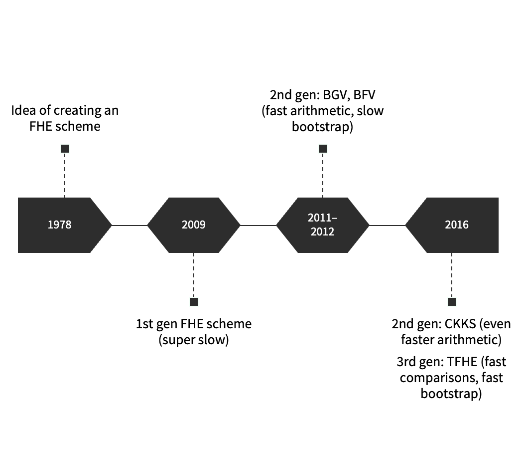 With the very first FHE scheme, it took on the order of minutes to multiply two encrypted numbers together.